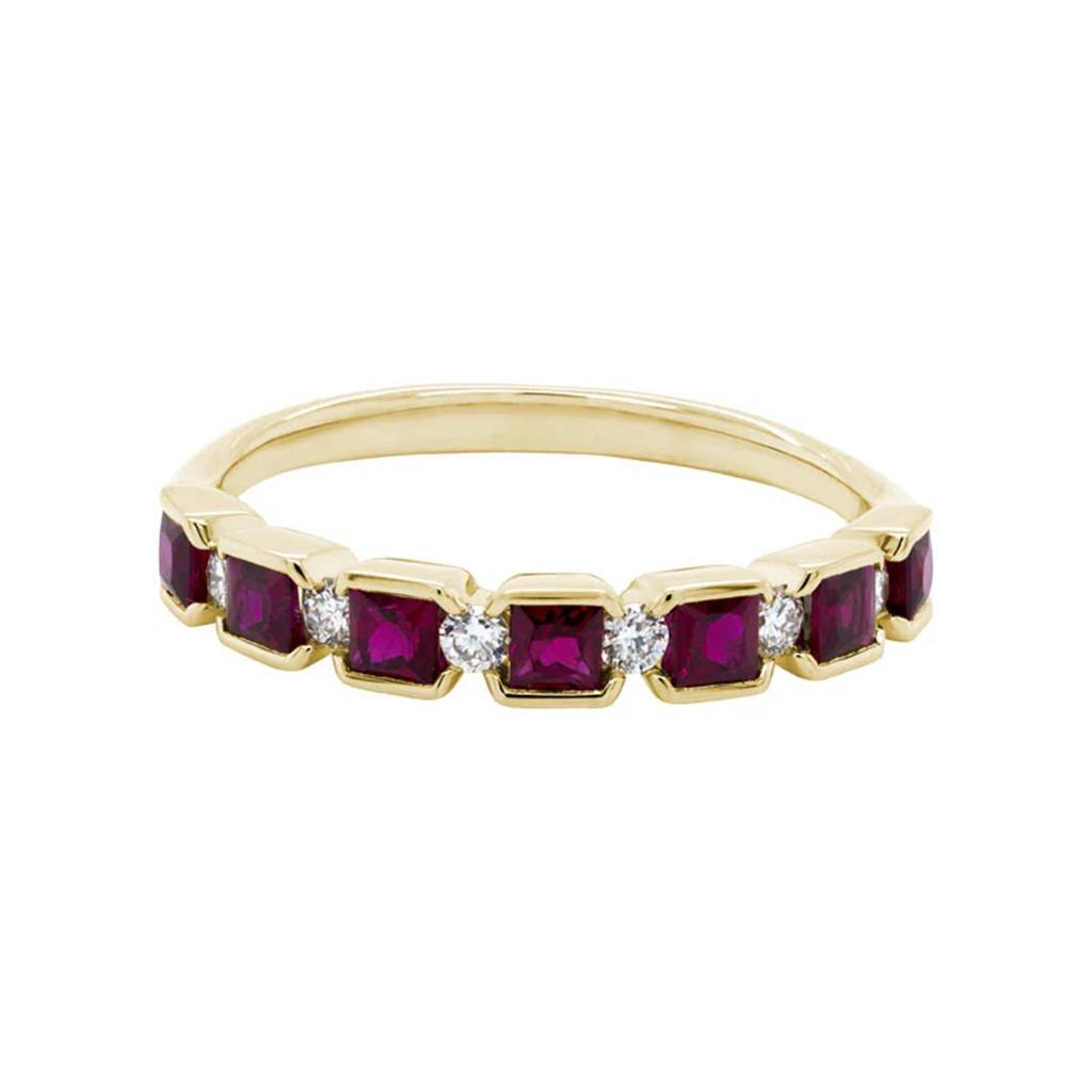 This elegant Davis Classics band showcases a sleek 14k yellow gold silhouette adorned with alternating gems for timeless sophistication. Seven bar-set square cut rubies totaling 0.73 carats bring vivid color to the design, while six prong-set round brilliant cut diamonds add 0.15 carats of shimmering contrast. With G/H color and SI2 clarity, the diamonds enhance the natural allure of the rubies, making this band ideal for stacking or wearing solo. This ring is currently available in size 6.5, with other sizes available for special order upon request.