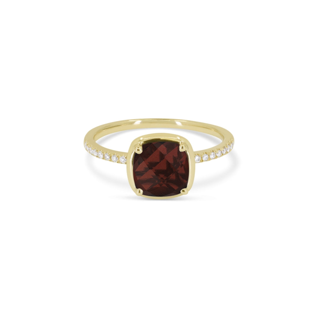 This sophisticated 14k yellow gold fashion ring features a striking checkerboard cushion-cut natural Mozambique garnet weighing 2.02 carats, radiating a rich, deep red hue. Enhancing the center stone are 18 prong-set round brilliant-cut diamonds along the shank, totaling 0.07 carats and sparkling with G/H color and SI1 clarity for refined contrast and brilliance. Currently available in size 6.5, with other sizes available for special order upon request, this ring offers a timeless blend of bold color and elegant craftsmanship.