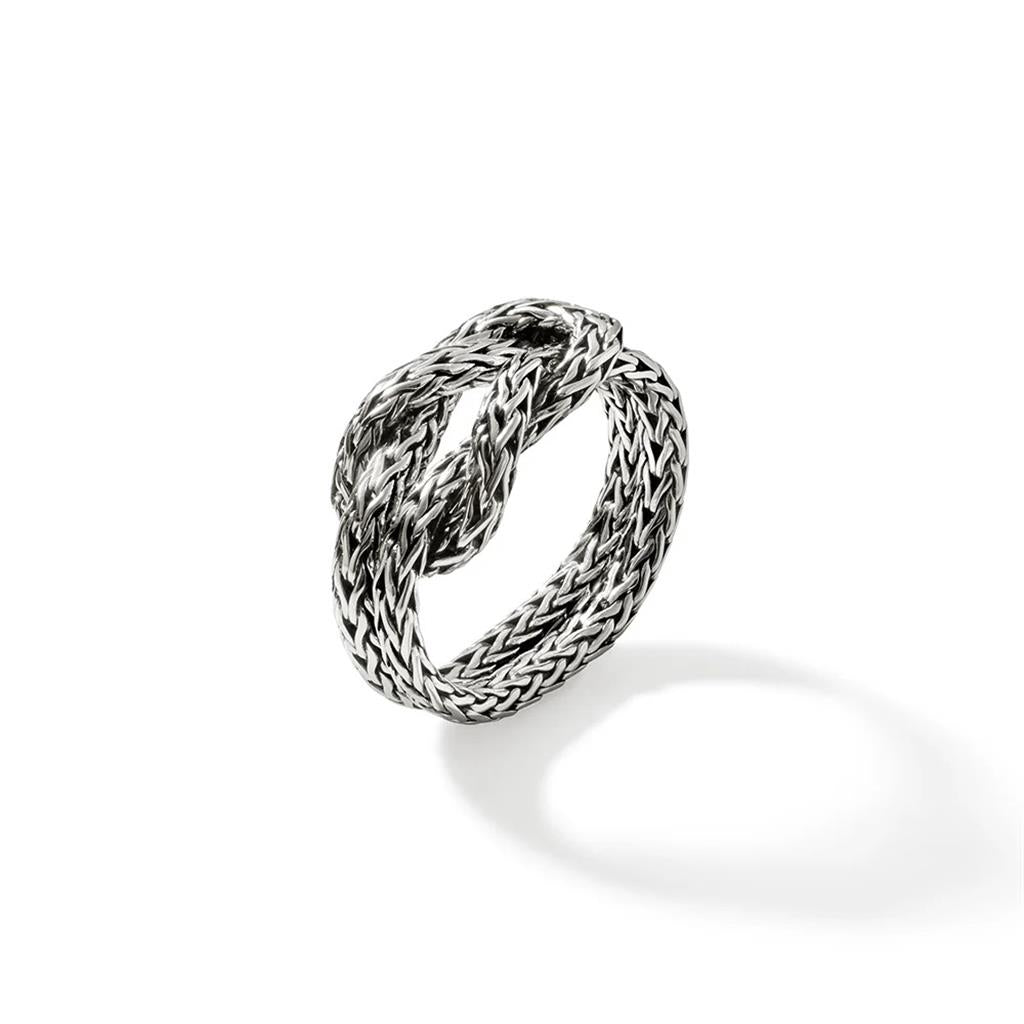 Right over left, left over right. Separately woven chains are tied by hand into a binding knot, synonymous with commitment, resilience and love. Finger size 7 in stock, additional sizes available for special order. Style no. RB901039