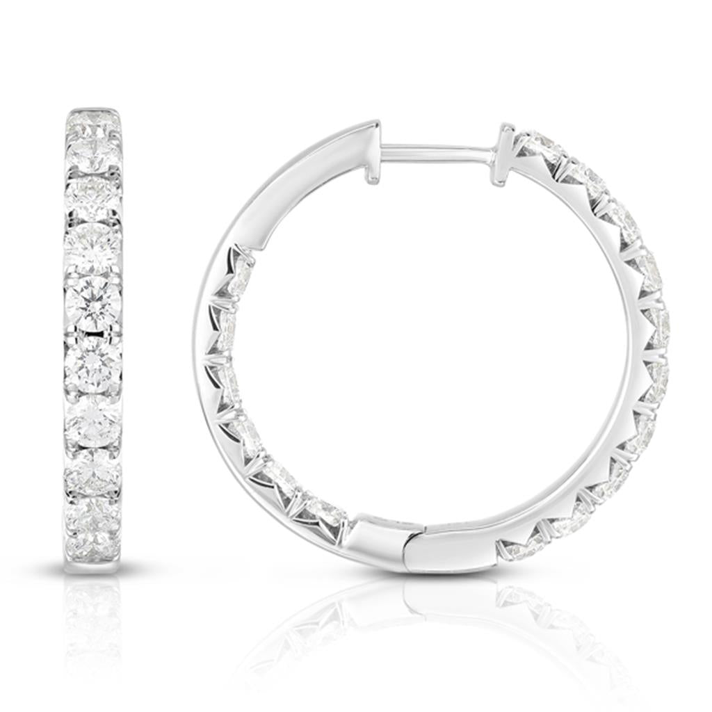 These dazzling Davis Signature 14k white gold hoop earrings feature a 1" in-and-out design adorned with 32 cut-down prong-set round brilliant-cut diamonds, totaling 3.00 carats, with I-J color and SI1-SI2 clarity. Secured with full closure clasps, these earrings combine timeless elegance with radiant brilliance, perfect for making a statement on any occasion.