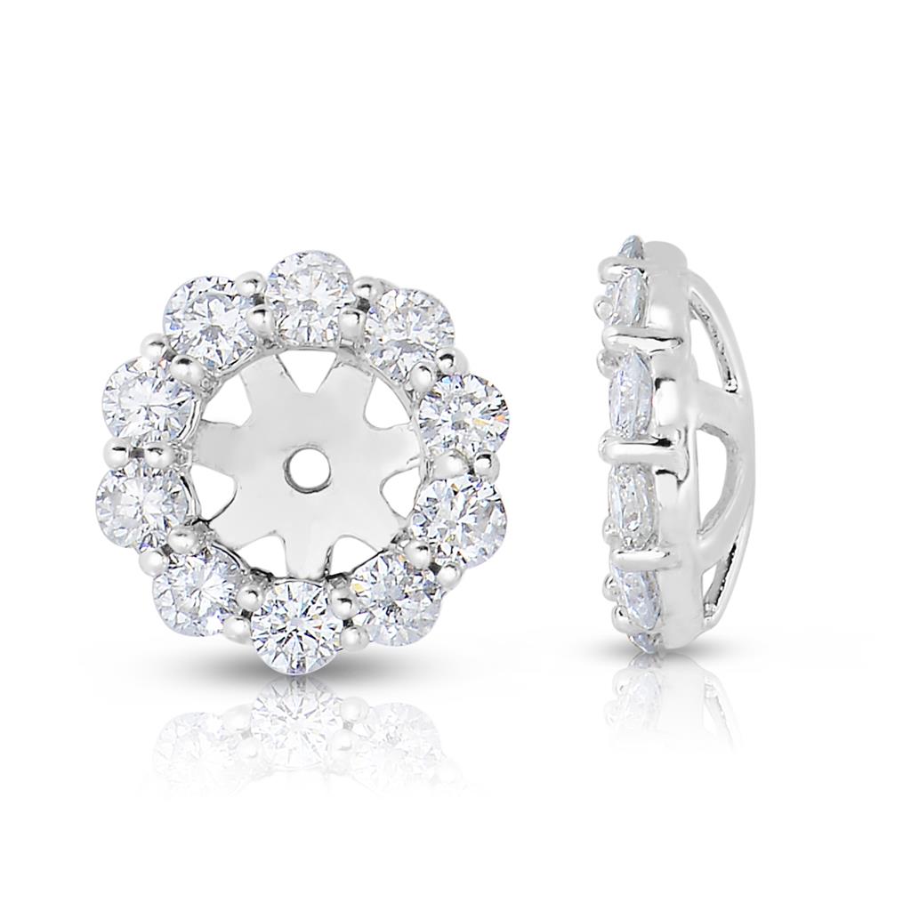 Build upon your stud earrings with these stunning Davis Classics 14k white gold diamond earring jackets. Designed to hold 0.50ct round brilliant centers, they feature 18 shared prong-set round brilliant-cut diamonds, totaling 0.91 carats, with I/J color and SI1-SI2 clarity. These jackets add a dazzling halo of brilliance, elevating your earrings for a sophisticated and elegant look.