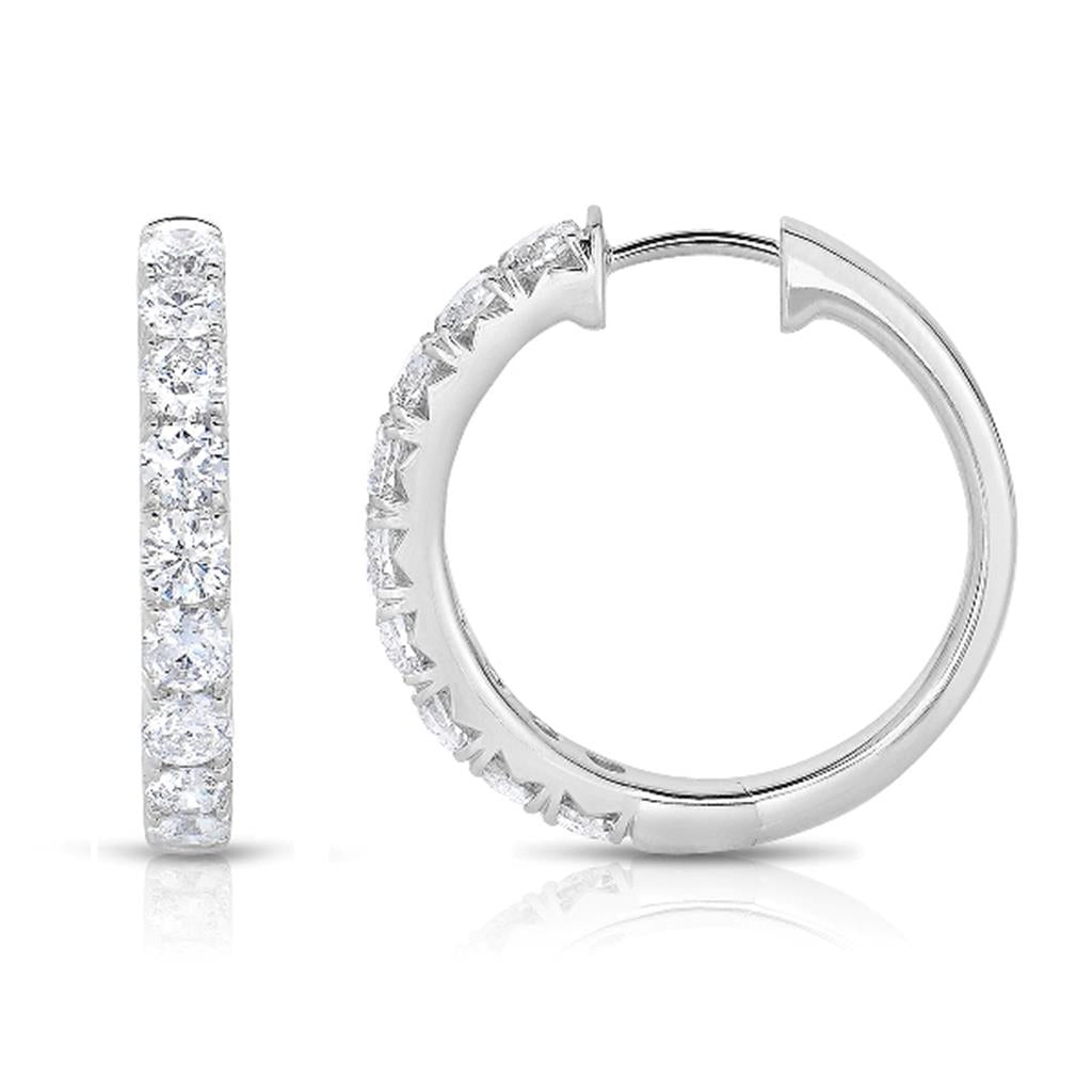 The Davis Signature 14k White Gold Diamond Hoop Earrings are a stunning expression of timeless elegance. These exquisite hoops feature 18 prong set round brilliant cut diamonds, totaling an impressive 1.50 carats, with I/J color and SI1 clarity. The diamonds radiate a brilliant sparkle, making these earrings a perfect choice for elevating any outfit, whether for everyday wear or special occasions. Designed with full closure locking clasps, these hoops offer both security and comfort. These diamond hoops are a luxurious and versatile addition to any jewelry collection, embodying classic beauty with a modern touch.
