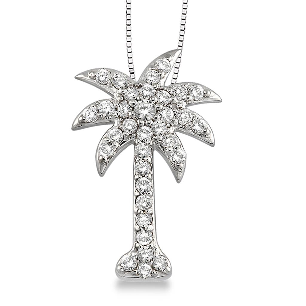 Bring a touch of tropical elegance to your style with this Davis Classics 14k white gold palm tree pendant necklace. Featuring 33 shared prong-set round brilliant-cut diamonds, totaling 0.50 carats, with K/L color and I1-I2 clarity, this whimsical design sparkles with every movement. The pendant hangs gracefully from an adjustable 16"-18" chain, secured with a lobster clasp for versatile wear.
