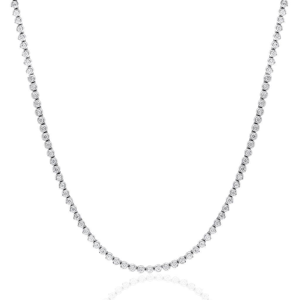 This exquisite 14k white gold 17-inch diamond tennis necklace radiates timeless elegance, featuring 113 bezel-set round brilliant-cut diamonds, totaling 5.00 carats with G/H color and SI1 clarity. Designed for effortless sophistication, this stunning piece is secured with a safety lock tongue clasp, making it a luxurious addition to any fine jewelry collection.