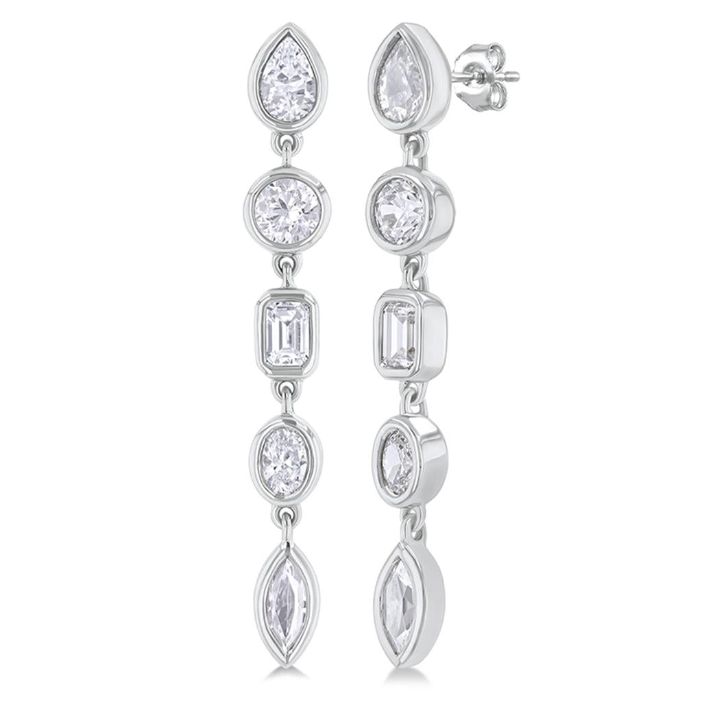Elegant and unique, these Davis Classics diamond drop earrings showcase a stunning blend of shapes, creating a captivating statement. Crafted in 14k white gold, the design features two bezel-set pear cut diamonds, two prong-set round brilliant cut diamonds, two bezel-set emerald cut diamonds, two bezel-set oval cut diamonds, and two bezel-set marquise cut diamonds. Together, these exquisite stones total 1.00ctw of I/J color and SI2-I1 clarity. Secured with friction posts and backs, these earrings are perfect for adding a touch of modern sophistication to any look.