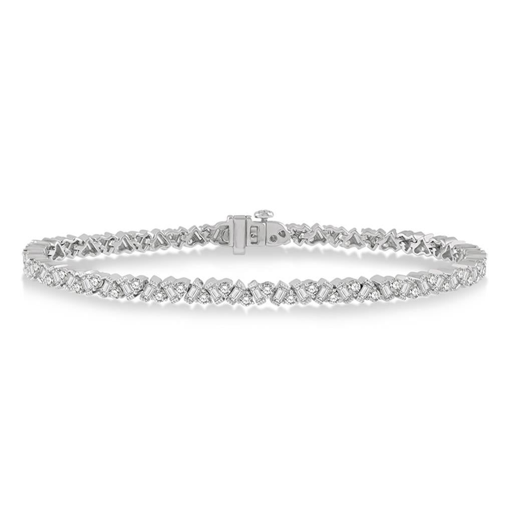 The Davis Classics 14k White Gold Scattered Zigzag Design Diamond Fashion Bracelet features a dynamic and eye-catching design. The bracelet is adorned with fifty-six bar-set baguette diamonds alternating with fifty-six prong-set round brilliant-cut diamonds, totaling 3.00 carats. These diamonds exhibit H/I color and SI2-SI3 clarity. The 7-inch bracelet is secured with a safety lock push box clasp, combining elegance and security. This stunning piece adds a modern twist to any jewelry collection, perfect for both special occasions and everyday wear.