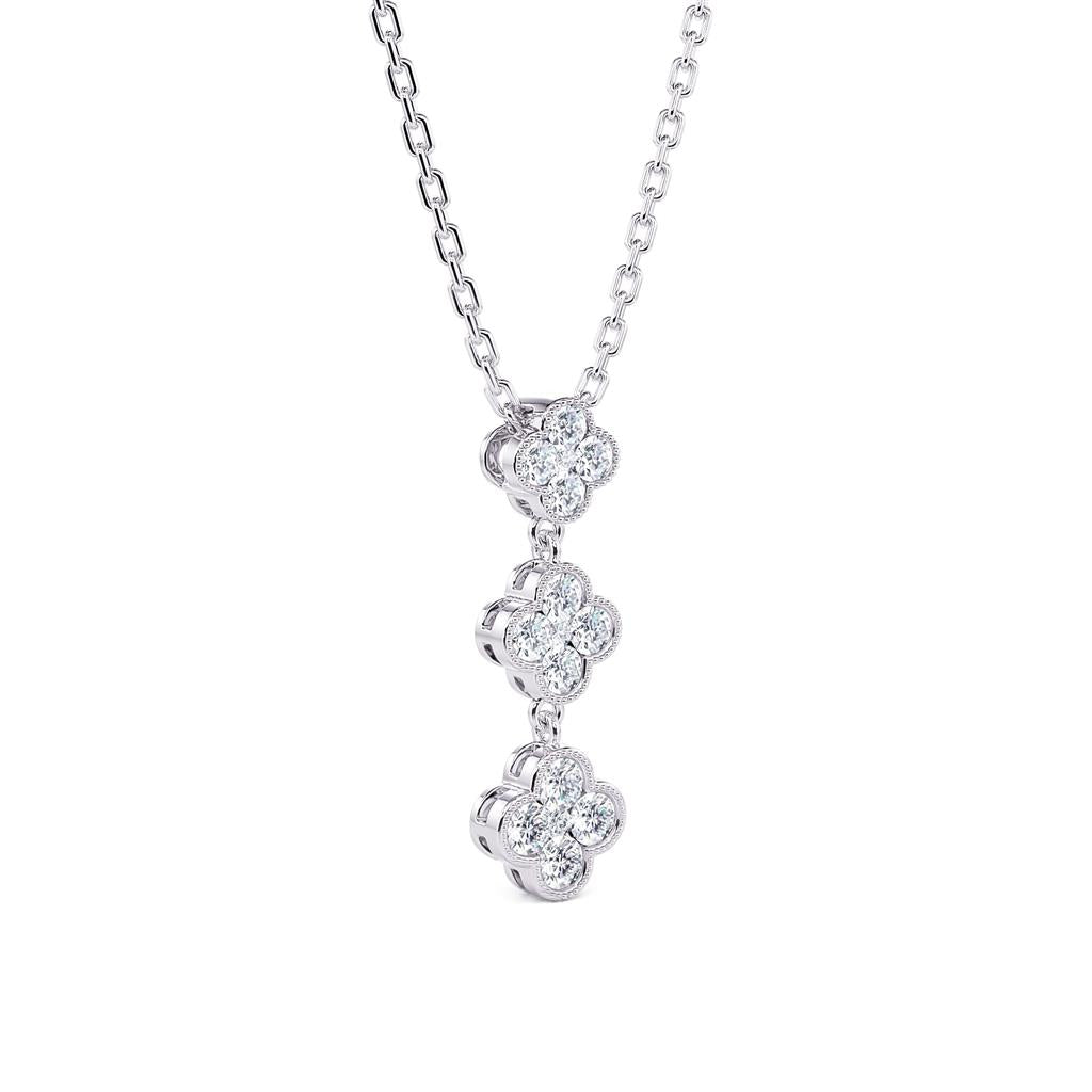 The Davis Classics 14k White Gold Triple Clover Design Drop Pendant is a beautifully crafted piece that combines elegance and intricate detailing. This exquisite pendant features a triple clover design adorned with 15 prong-set round brilliant cut diamonds, totaling 0.51 carats, with G/H color and VS1-VS2 clarity. The delicate milgrain detailing around the clover motifs adds a vintage-inspired touch, enhancing the pendant's overall sophistication. Suspended on an adjustable 16-18" rolo chain and secured with a lobster clasp, this pendant is perfect for both everyday elegance and special occasions. A timeless and charming addition to any jewelry collection, offering a blend of modern and classic design elements.