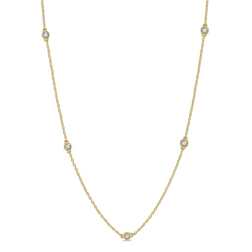 This elegant Davis Classics 14k yellow gold Diamond by the Yard necklace features 11 bezel-set round brilliant-cut diamonds, each measuring 2.7mm, with a total weight of 0.75 carats. The diamonds, showcasing I/J color and SI2-I1 clarity, are evenly spaced along an adjustable 16-18" chain secured with a lobster clasp. A timeless and versatile design, perfect for layering or wearing alone.