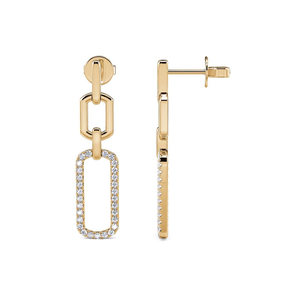 The Davis Luxe 14k Yellow Gold Double Open Link Design Diamond Dangle Earrings are a stunning blend of contemporary style and classic elegance. These earrings feature a double open link design adorned with 58 prong-set round brilliant cut diamonds, totaling 0.35 carats, with G/H color and VS1-VS2 clarity. The diamonds add a beautiful sparkle, while the warm 14k yellow gold enhances their brilliance. Secured with friction post backs for comfort and security, these dangle earrings are perfect for adding a touch of sophistication to both everyday outfits and special occasions. These earrings are a chic and luxurious addition to any fine jewelry collection.