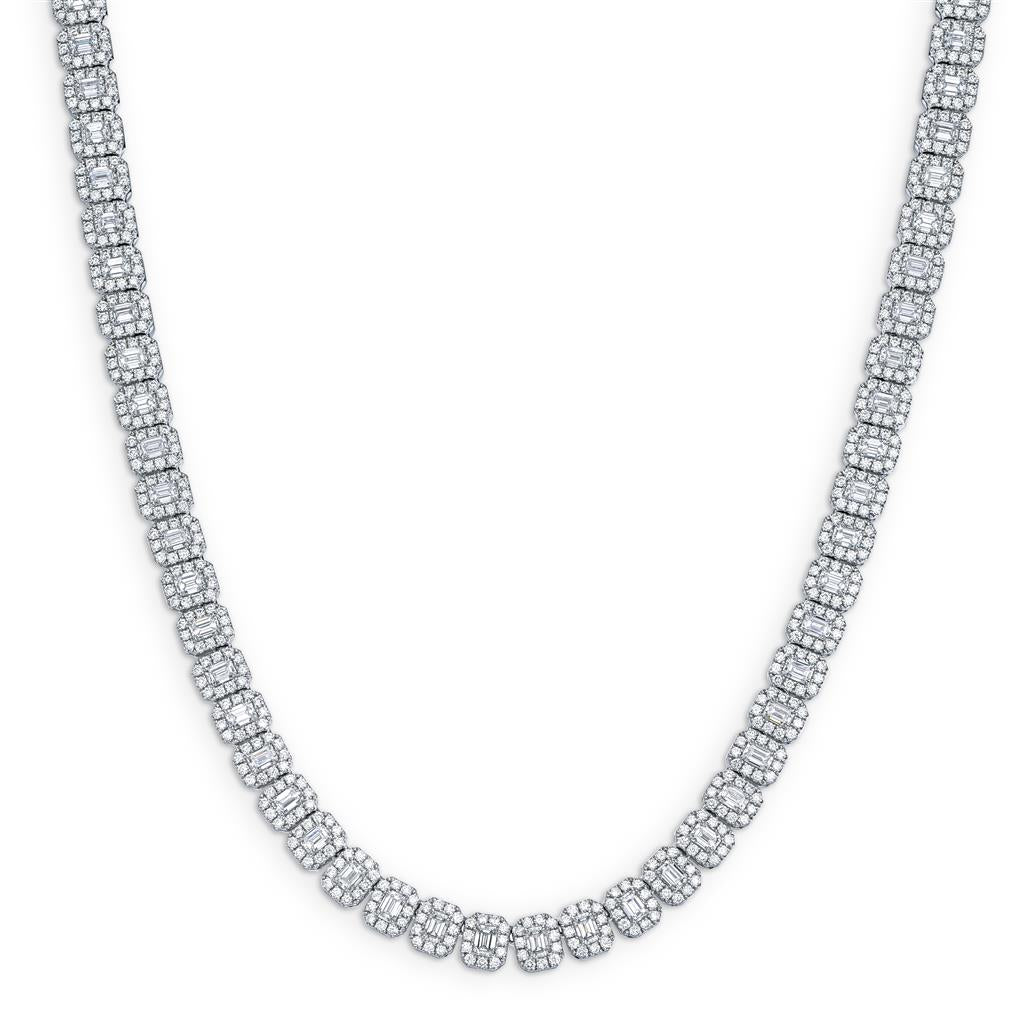 This breathtaking 18k white gold 16-inch straight line necklace showcases 80 North/South prong-set emerald-cut diamond centers, totaling 7.79 carats, each elegantly framed by 800 prong-set round brilliant-cut diamonds, adding an additional 4.95 carats of brilliance. With G/H color and VS1 clarity throughout, this exquisite piece radiates sophistication and luxury. Secured with a safety lock tongue clasp, this dazzling necklace is a timeless statement of refined elegance.