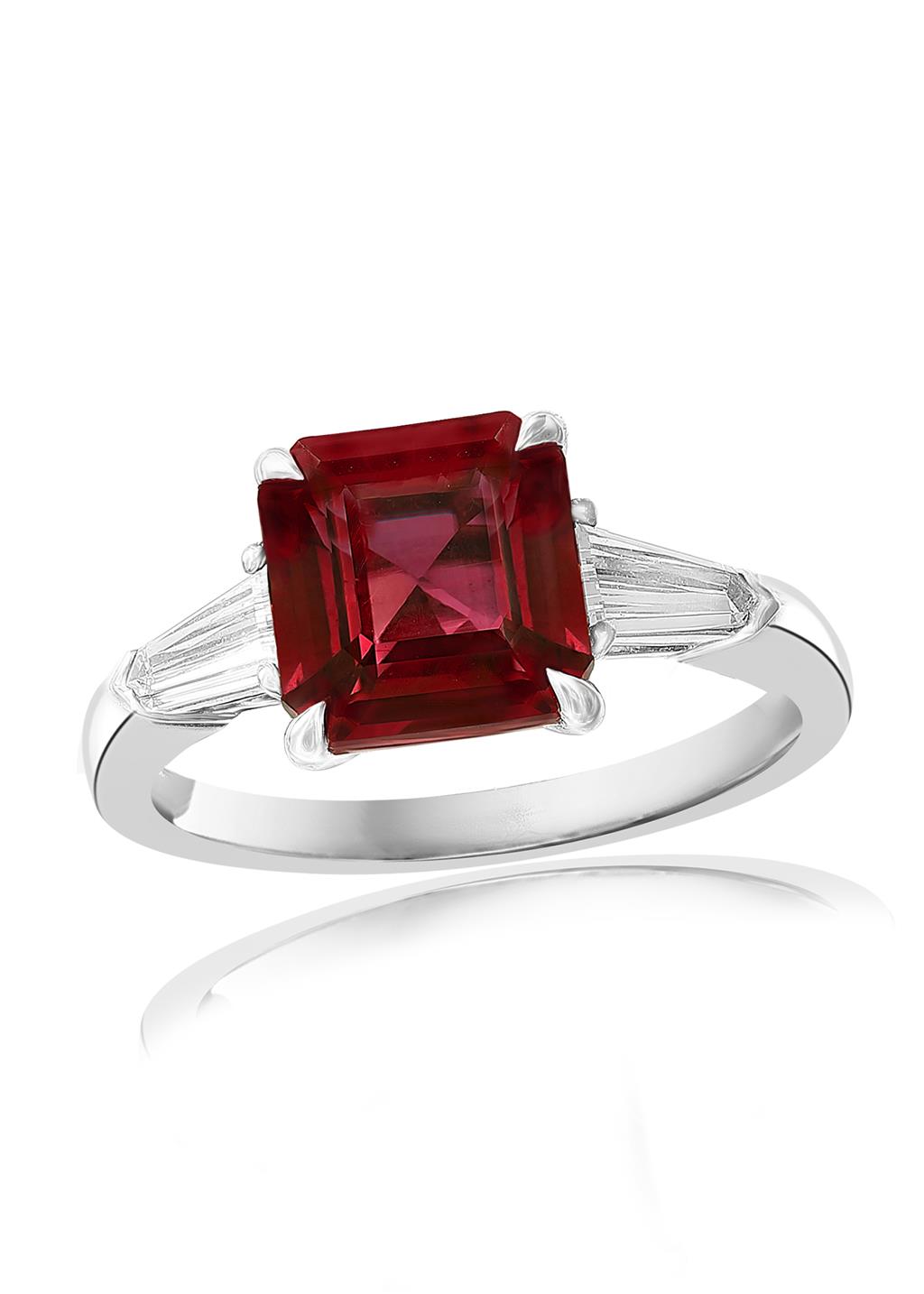 This extraordinary platinum three-stone fashion ring showcases a cat-nail prong-set heat-treated natural cushion step-cut Madagascar ruby, measuring 8.05 x 7.80 x 4.65mm and weighing 3.02 carats. Flanked by two prong-set tapered baguette-cut side diamonds, totaling 0.40 carats with G/H color and VS2-SI1 clarity, this ring radiates timeless sophistication. Currently available in size 6, with other sizes available for special order upon request, this stunning design is a bold and elegant statement of refined luxury.