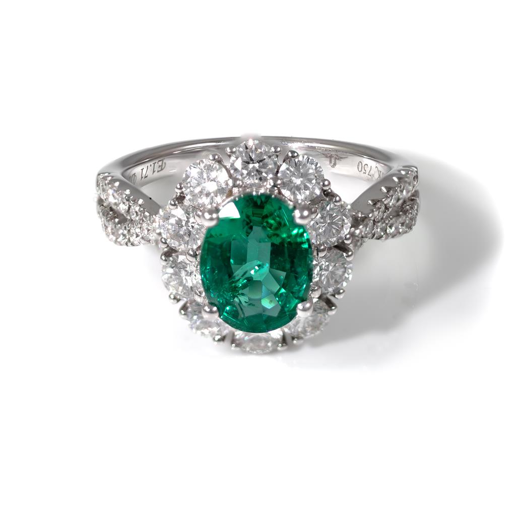This breathtaking 18k white gold fashion ring showcases a striking oval-cut emerald at its center, measuring 8.95 x 6.97 x 4.37 mm and weighing 1.71 carats, with a medium-dark tone, vivid saturation, and a very slightly bluish-green hue, complemented by VS clarity. The emerald is framed by 10 shared prong-set round brilliant-cut diamonds, while an additional 30 prong-set round brilliant-cut diamonds sweep along the crossover-style shank, creating a fluid halo effect and exceptional sparkle. Together, the diamonds total 1.26 carats and shimmer with G/H color and VS2 clarity. Currently available in size 6.5, with other sizes available for special order upon request, this ring is a luminous expression of refined color, movement, and timeless elegance.