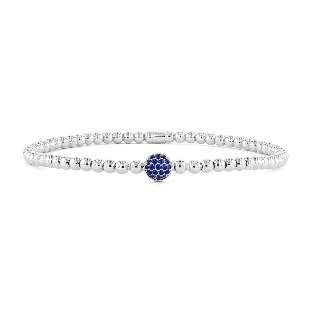 This refined 18k white gold beaded stretch bracelet features a striking circle station accented with pavé-set natural blue sapphires, each measuring 1.2 mm. The sapphires’ deep, radiant hue adds a vivid touch of color to the polished gold beads, blending timeless luxury with contemporary elegance. Designed in a comfortable medium stretch fit, this bracelet offers effortless sophistication whether worn alone or layered with other pieces.