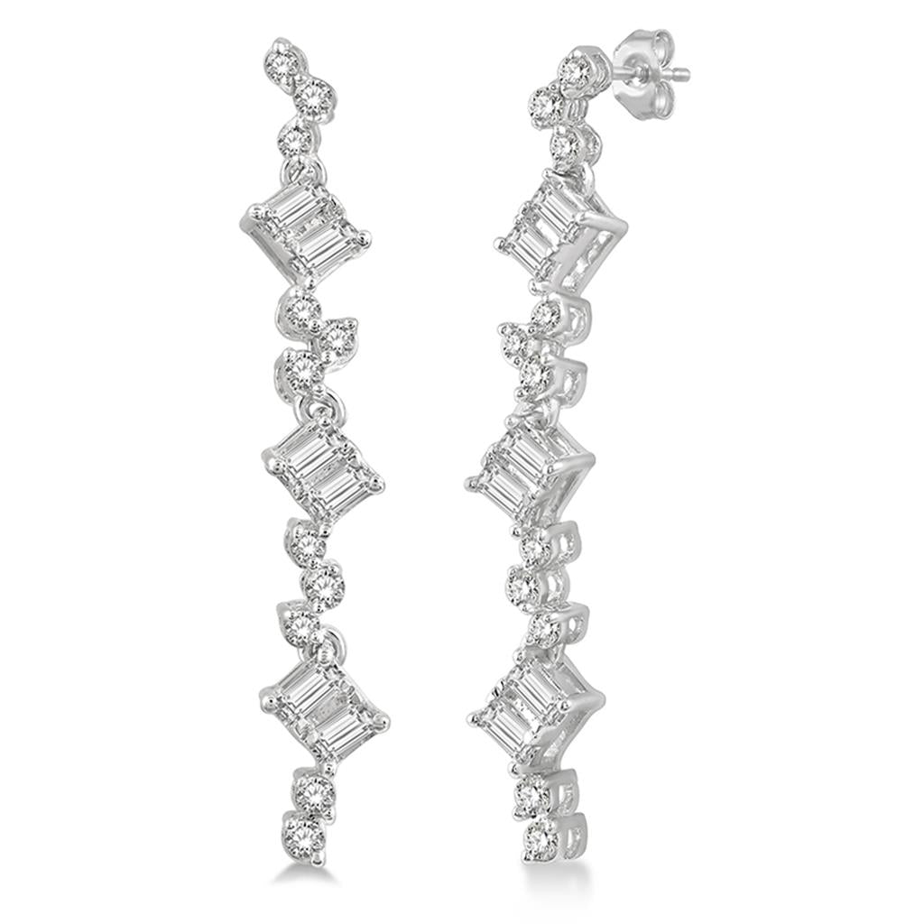 The Davis Signature 14k White Gold Scattered Design Linear Drop Diamond Earrings feature a modern and elegant design, adorned with twenty-two prong-set round brilliant-cut diamonds and twelve prong-set straight baguette-cut diamonds. With a total diamond weight of 0.50 carats, these diamonds shine with H/I color and SI2-SI3 clarity. Secured with friction posts and backs, these earrings offer a sophisticated and stylish addition to any jewelry collection.