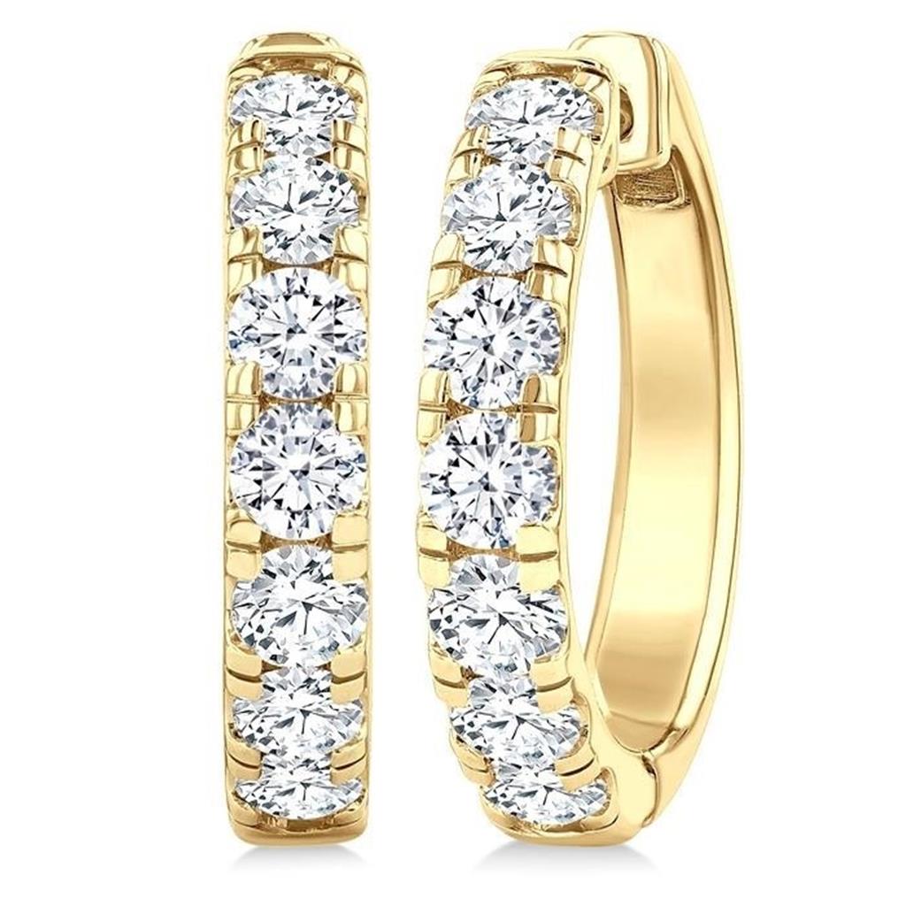 Classic and radiant, these Davis Signature hoop earrings are crafted in rich 14k yellow gold and measure approximately 21mm in diameter. The design features 14 prong-set round brilliant-cut diamonds measuring approximately 3.5mm, totaling 2.00 carats.