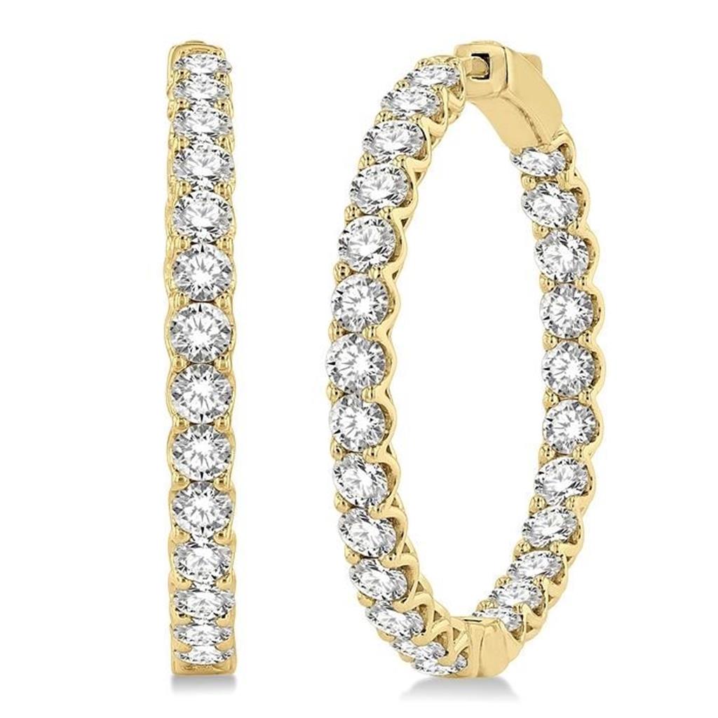 Set along both the inside and outside of each hoop, the diamonds create a continuous circle of sparkle from every angle. Graded I/J color with SI2–I1 clarity, they offer eye-catching brilliance and substantial presence.