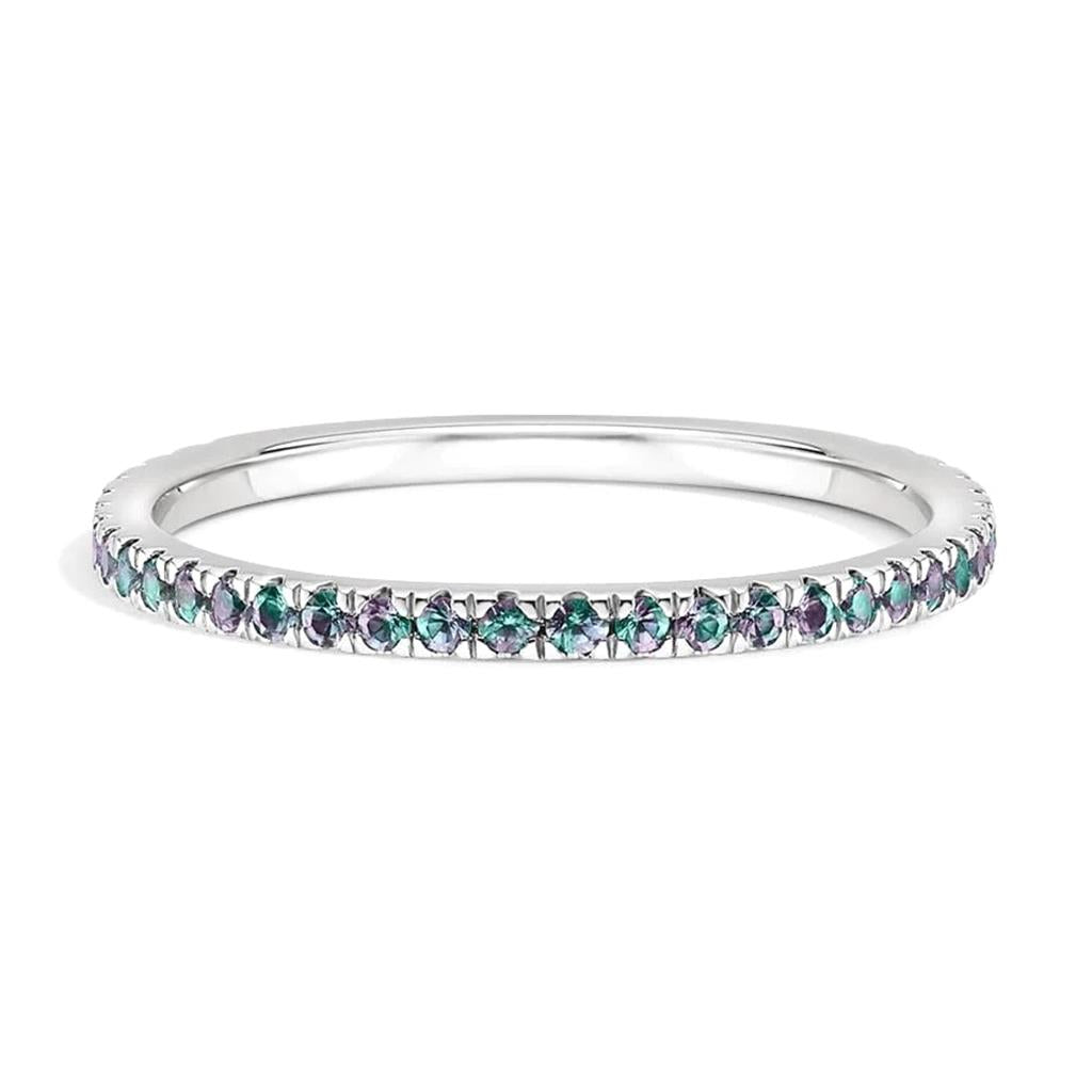 This elegant 14k white gold stackable band is set with 19 prong-set round genuine alexandrites, each measuring 1.45 mm and prized for their captivating color-changing beauty. The vivid gemstones create a refined line of brilliance, making this band perfect for stacking, wearing as a birthstone ring, or enjoying as a subtle statement on its own. Currently available in size 6, with other sizes available for special order upon request.