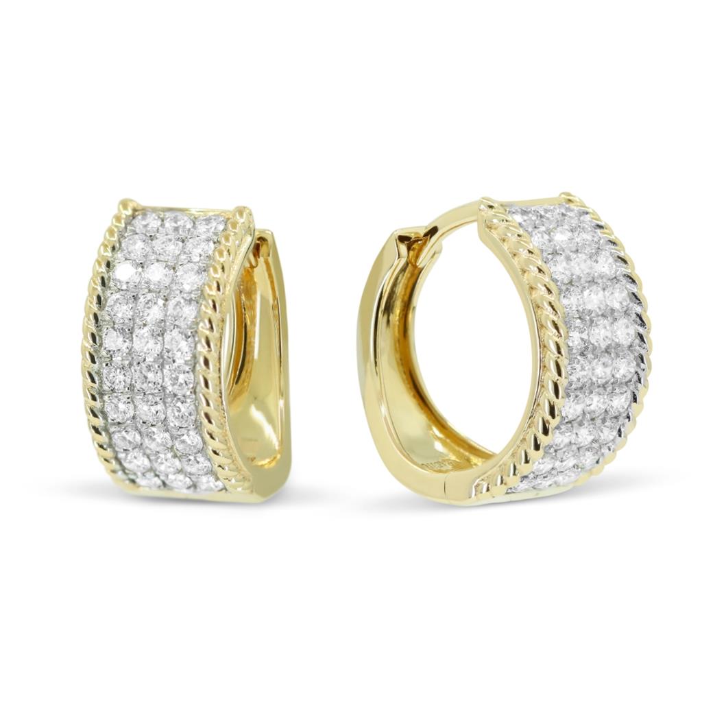 Add a touch of elegance to any ensemble with the Davis Signature 14k yellow gold huggie hoop earrings. Featuring a sophisticated rope detail, these earrings are adorned with 60 pave-set round brilliant cut diamonds, totaling 0.60 carats of G/H color and SI1-SI2 clarity. The hinged locking full closure clasps ensure a secure and comfortable fit. These earrings seamlessly blend classic charm with modern flair, making them a perfect addition to your jewelry collection.