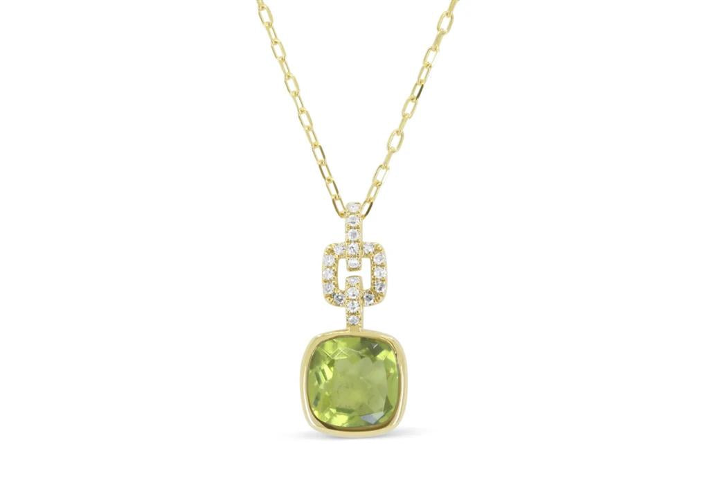 This stunning drop pendant showcases a bezel-set cushion cut Peridot center, measuring 7mm and weighing 1.56 carats. The vibrant Peridot is accented by 19 prong-set round brilliant cut diamonds, totaling 0.11ctw, with G/H color and SI2 clarity. Suspended on an 18" diamond cut cable chain with a secure lobster clasp, this pendant exudes elegance and sophistication, making it a perfect addition to any jewelry collection.