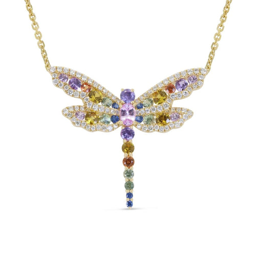Davis Luxe 14k Yellow Gold Dragonfly Multi-Colored Sapphire and Diamond Pendant Necklace