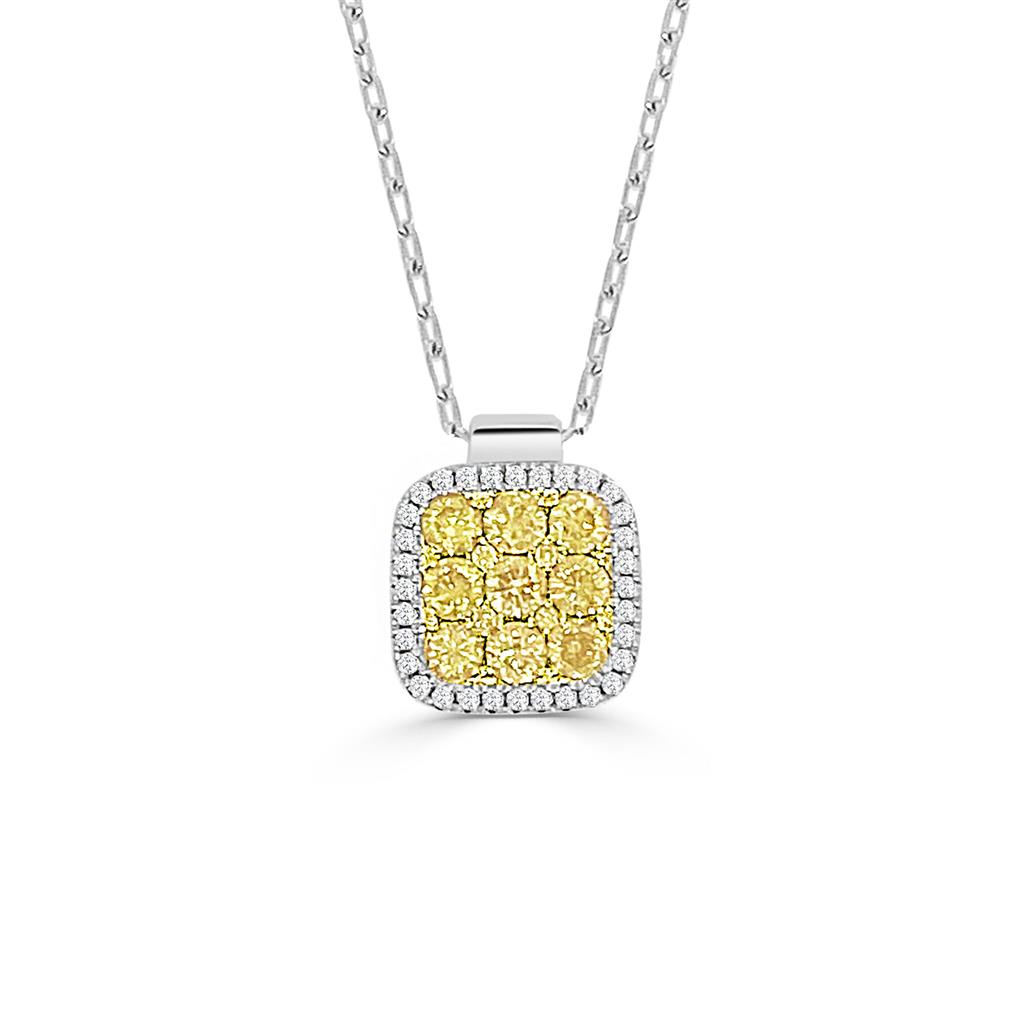 This captivating 14k white and yellow gold drop pendant by Frederic Sage features 13 prong-set Fancy Yellow diamonds at its center, totaling 0.47 carats, exuding a warm, radiant glow. Framing the yellow diamonds are 32 round brilliant-cut diamonds, weighing 0.08 carats, with G/H color and SI1-SI2 clarity, creating a dazzling halo effect. Suspended from an 18-inch diamond-cut chain with a lobster clasp, this pendant beautifully combines striking color with timeless elegance for a truly exquisite piece.