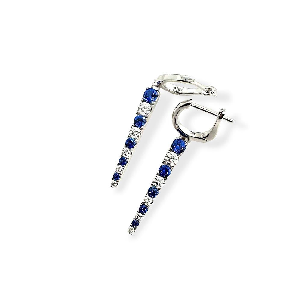 Sleek and striking, these 14k white gold spear design drop earrings feature a stunning interplay of gemstones and diamonds. Showcasing 10 graduated round natural blue sapphires, weighing a total of 0.60 carats, each stone alternates with 10 graduated prong-set round brilliant cut diamonds, totaling 0.43 carats with F/G color and VS2-SI1 clarity. The exquisite combination of deep blue sapphires and sparkling diamonds brings a modern yet elegant touch to these earrings, which are securely fastened with locking lever clasps for a comfortable fit. These earrings are a timeless addition to any jewelry collection.