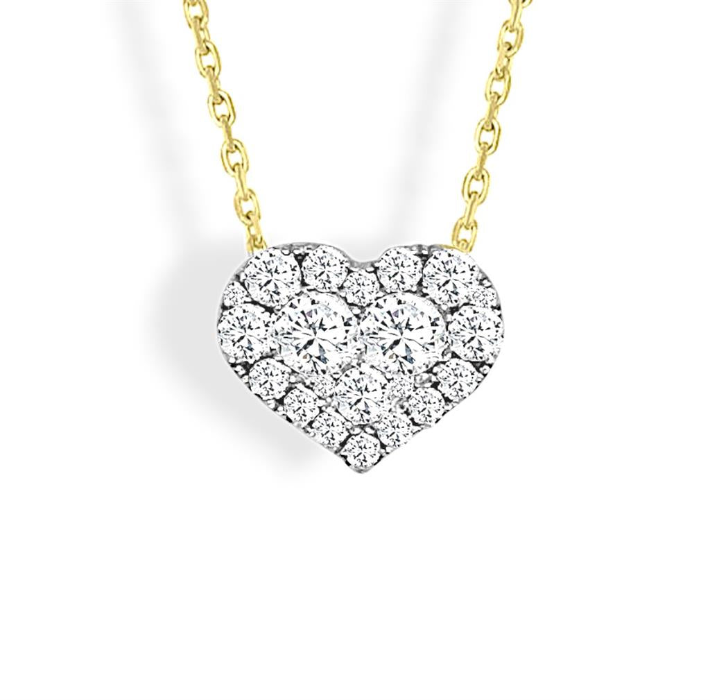 From the Frederic Sage Firenze Collection, this 14k yellow and white gold heart-shaped drop pendant sparkles with 22 prong-set round brilliant-cut diamonds, totaling 0.65 carats. The diamonds, boasting F/G color and VS2-SI1 clarity, illuminate the 12 x 10mm design, creating a radiant symbol of love and elegance. Suspended from an 18-inch diamond-cut cable chain with a lobster clasp, this pendant offers a beautiful fusion of timeless craftsmanship and contemporary charm, perfect for any special occasion