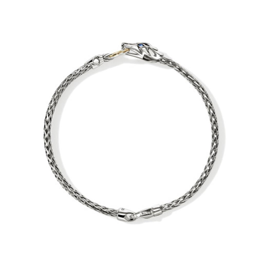 John Hardy Naga collection Sterling Silver & 14k yellow gold Station bracelet with Blue Sapphire eyes on a 3.5mm Slim Chain with Lobster Clasp