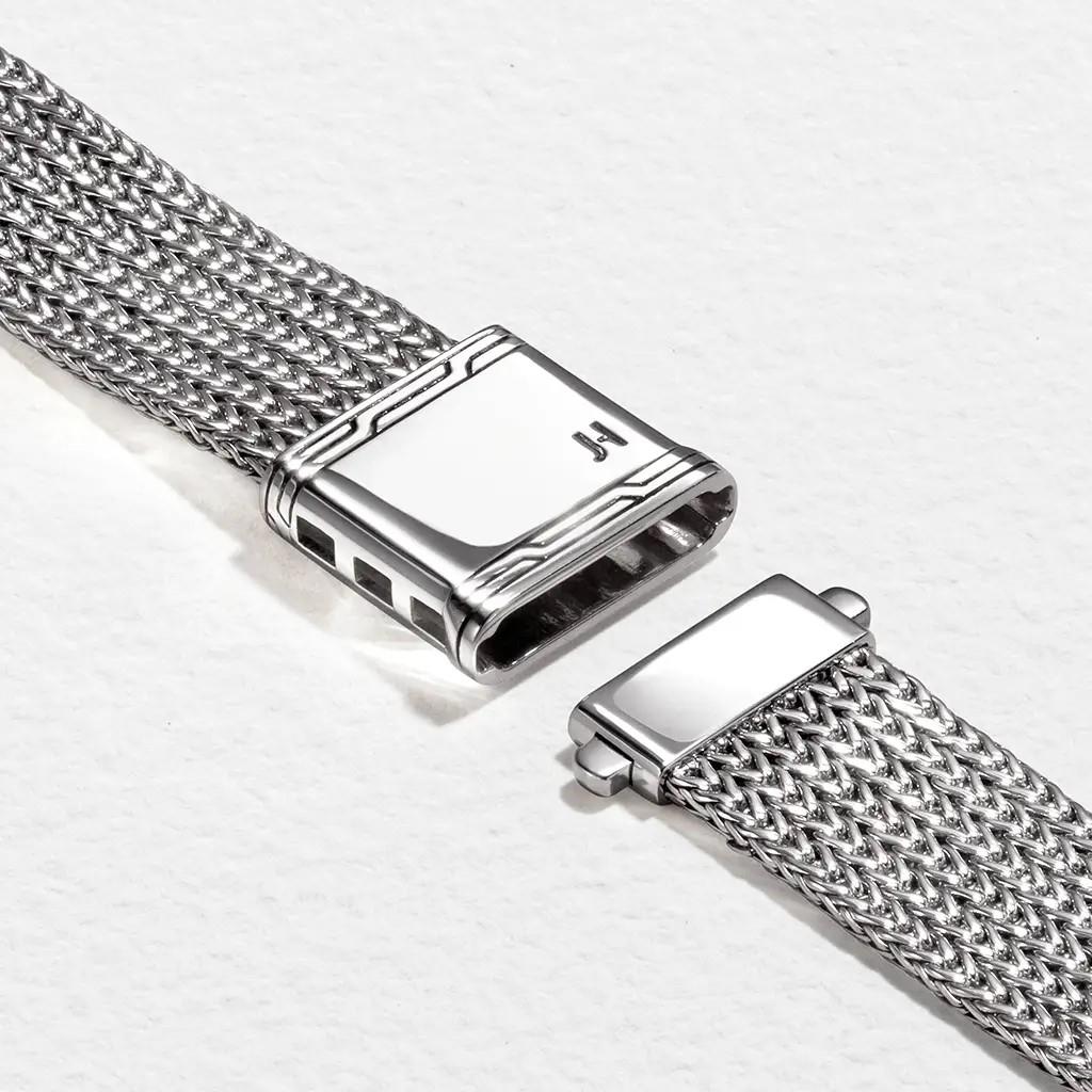 Function and form. A bold strap in reclaimed sterling silver, featuring an adjustable tri-button pusher clasp with three fit settings for optimal snugness on your wrist. Artisan handcrafted. Gauge 18mm. Size small. Style no. WB98652