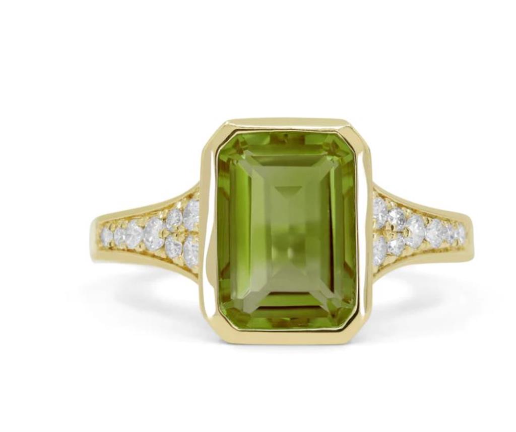 Discover timeless elegance with the Madison L 14k yellow gold Essentials Collection fashion ring. This exquisite piece features a stunning bezel-set emerald cut Peridot center, weighing 3.17 carats, framed by 16 prong-set round brilliant cut diamonds totaling 0.22 carats. With G/H color and SI2 clarity, the diamonds add a brilliant sparkle that complements the vibrant Peridot. The ring, available in a finger size 6.5 and available in other sizes upon request, showcases the perfect blend of luxury and craftsmanship.