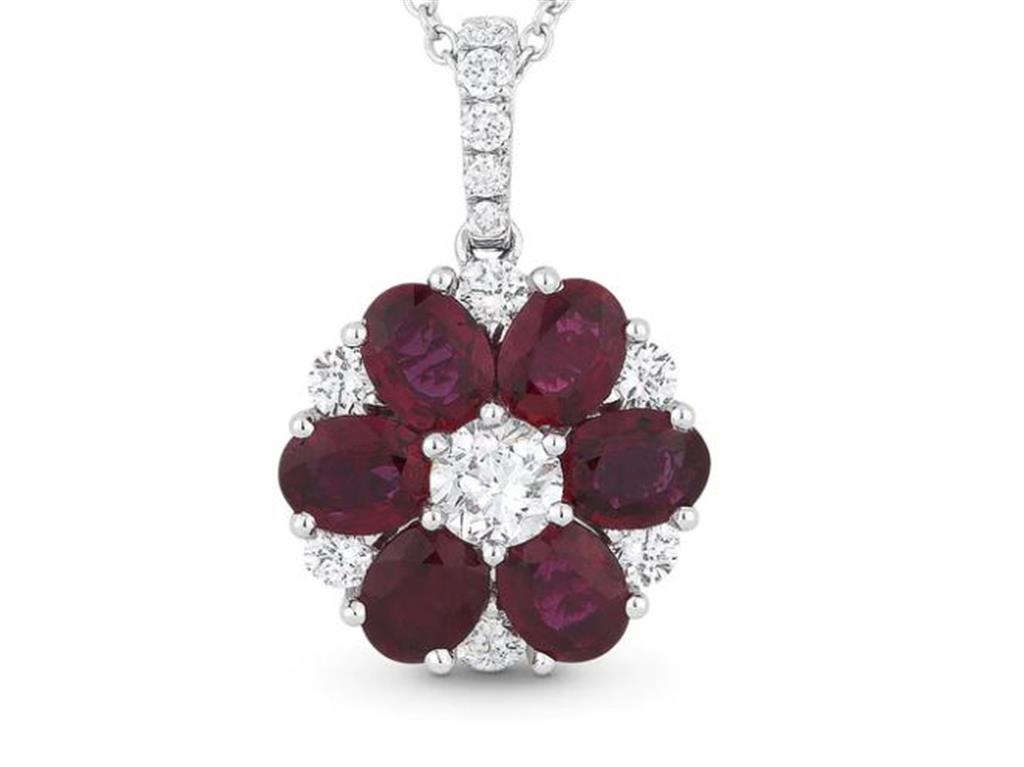 Elevate your style with the Madison L 18k white gold Arianna Collection floral design pendant. This exquisite piece features 6 prong-set oval rubies, each measuring 4 x 3mm and totaling 1.89 carats, surrounded by 12 prong-set round brilliant cut diamonds, weighing 0.52 carats of G/H color and SI2 clarity. The pendant is elegantly suspended on an 18-inch white gold cable chain with a lobster clasp, adding a touch of refined luxury to any ensemble.