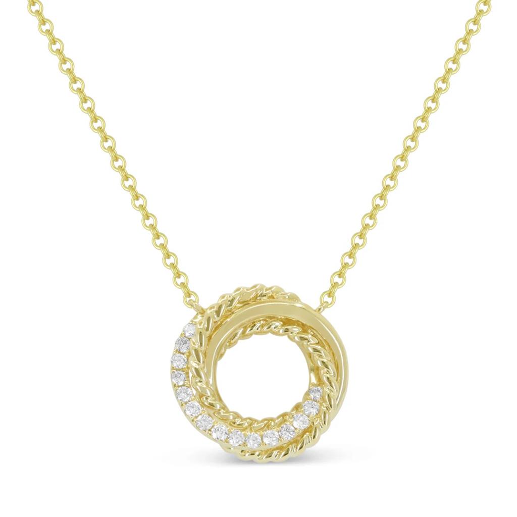 Graceful and full of texture, this open circle pendant necklace is crafted in 14k yellow gold and features a crossover design enriched with elegant rope detailing. A total of 22 prong set round brilliant cut diamonds sparkle along the pendant, weighing 0.27 carats total in G/H color and SI1-SI2 clarity. Suspended from an adjustable 16–18" chain and secured with a lobster clasp, this necklace is a timeless accent piece with a refined twist.