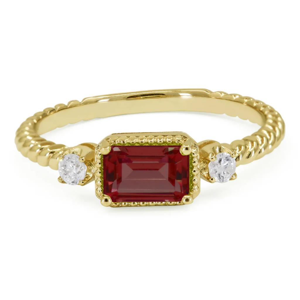 This elegant stackable ring from Madison L is crafted in 14k yellow gold with intricate bead and rope detailing. At its center rests a prong-set 0.79-carat emerald-cut Garnet measuring 4 x 6mm, flanked by two prong-set round brilliant cut diamonds totaling 0.09 carats, graded G/H color and SI2 clarity. A refined balance of color and sparkle, this ring is currently available in size 6.5, with other sizes available for special order upon request.
