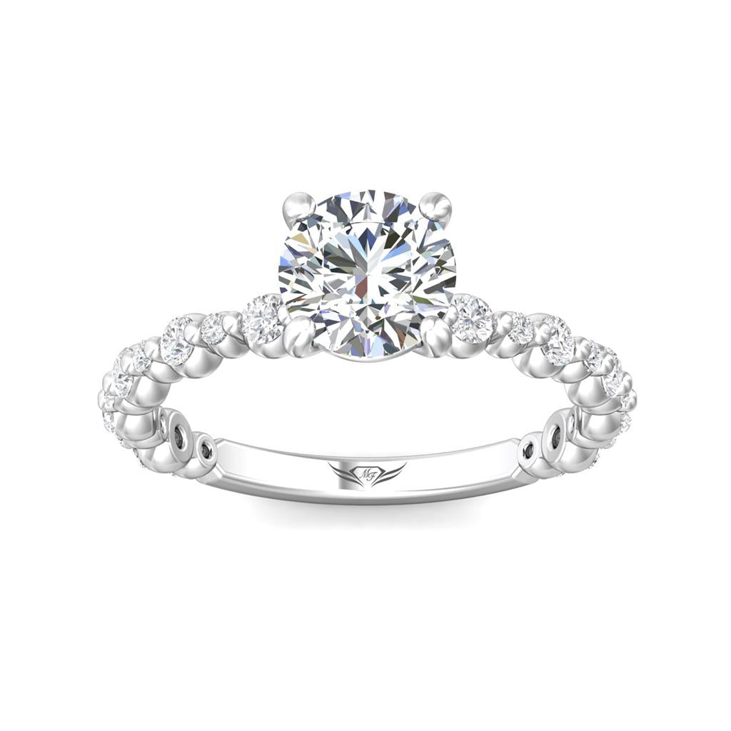 This elegant Martin Flyer engagement ring setting in 14k white gold features 22 shared single prong set round brilliant cut diamonds totaling 0.47 carats of H color and SI2 clarity. Designed to hold a 7mm round brilliant center, this setting enhances the center stone’s brilliance with a timeless and graceful shared prong arrangement. Available in finger size 6.5, with other sizes available upon request. Please note that the price is subject to change based on finger size and metal preference. The price does not include the center stone.