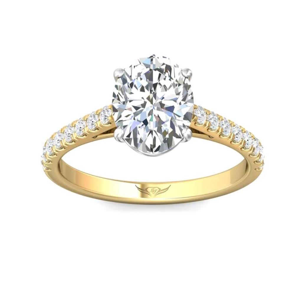 This captivating Martin Flyer engagement ring setting in 14k yellow gold features a cathedral design adorned with 16 micropave prong-set round brilliant cut diamonds, totaling 0.35 carats of H color, SI2 clarity. Crafted to hold a 1.5-carat oval center stone in a 14k white gold head, this setting combines elegance with a touch of sparkle, accentuating the beauty of the center stone. Available in finger size 6.5, with other sizes available upon request. Please note that the price is subject to change based on finger size and metal preference. The price does not include the center stone.