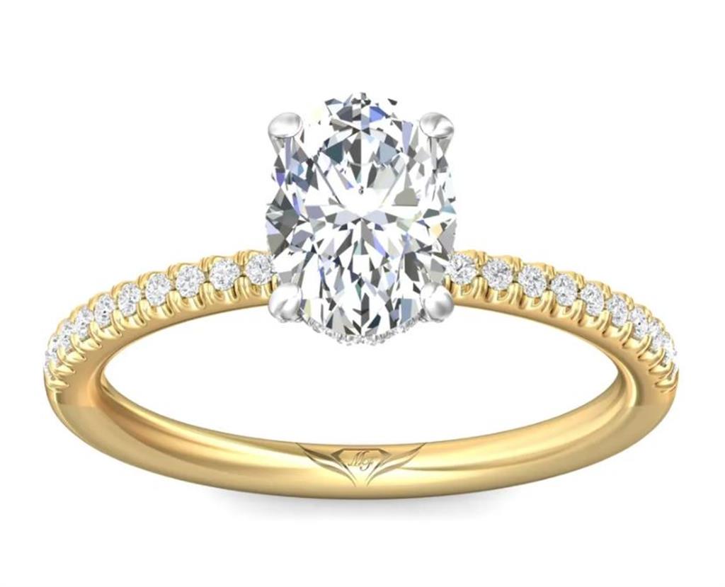 Crafted in 14k yellow gold, this FlyerFit engagement ring setting by Martin Flyer is designed to beautifully showcase an oval center stone. It features a delicate under halo and head adorned with 30 prong-set round brilliant cut diamonds, complemented by 22 prong-set round brilliant cut diamonds along the shank, totaling 0.24 carats of H color and SI2 clarity. The 14k white gold head provides a stunning contrast, enhancing the setting's classic elegance. Available in finger size 6.5, with other sizes available upon request. Please note that the price is subject to change based on finger size and metal preference. The price does not include the center stone.