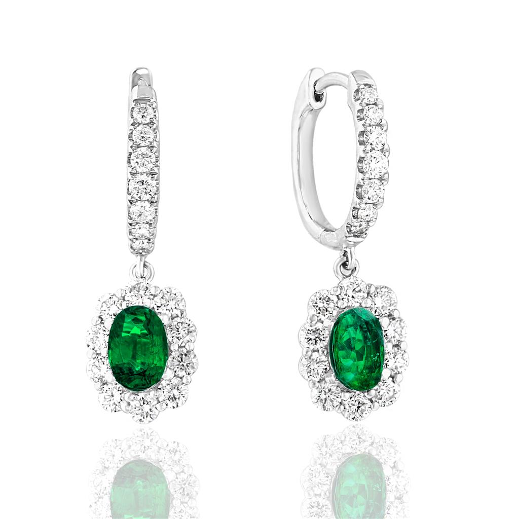 Vibrant and refined, these Davis Luxe drop hoop earrings are crafted in luminous 18k white gold and showcase two prong-set natural oval-cut Zambian emerald centers totaling 0.87 carats. The richly saturated green gemstones are framed and accented by 34 prong-set round brilliant-cut diamonds. The diamonds weigh 0.85 carats in total and exhibit G/H color with SI1 clarity, creating brilliant contrast against the vivid emeralds. Finished with secure locking full-closure clasps, these elegant earrings offer graceful movement, radiant sparkle and timeless sophistication.