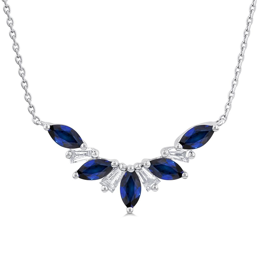 The Davis Signature 14k White Gold Contour Sapphire and Diamond Bar Pendant Necklace is a sophisticated and modern piece that exudes elegance. This adjustable 16-18" necklace features a sleek bar pendant adorned with six prong-set marquis cut sapphires, each measuring 5 x 2.5mm, arranged in a graceful contour. These deep blue sapphires are beautifully accented by four prong-set baguette cut diamonds, totaling 0.18 carats, with I/J color and SI2-I1 clarity. The contrast between the vibrant sapphires and the sparkling diamonds adds a touch of luxury to the design. Secured with a lobster clasp, this adjustable necklace offers both versatility and style, making it an ideal choice for any occasion. Perfect for those who appreciate the timeless beauty of gemstones combined with contemporary design, this necklace is a stunning addition to your jewelry collection.