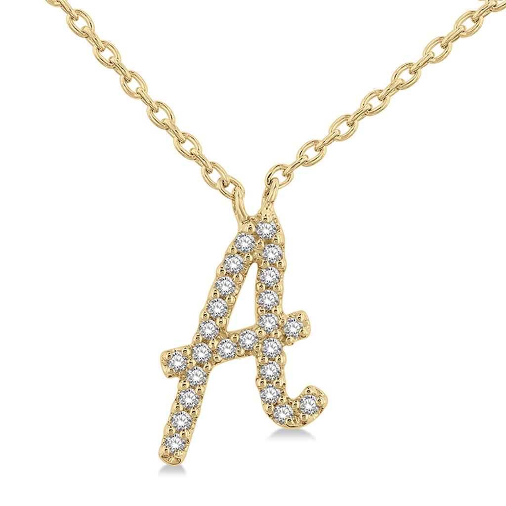 Crafted in radiant Davis Signature14k yellow gold, this adjustable 16–18" script pendant necklace features the letter “A” adorned with 23 shared prong-set round single cut diamonds totaling 0.07 carats, with I/J color and I1–I2 clarity. Finished with a spring ring clasp, this elegant and personal piece adds a touch of sparkle and charm to any jewelry collection.