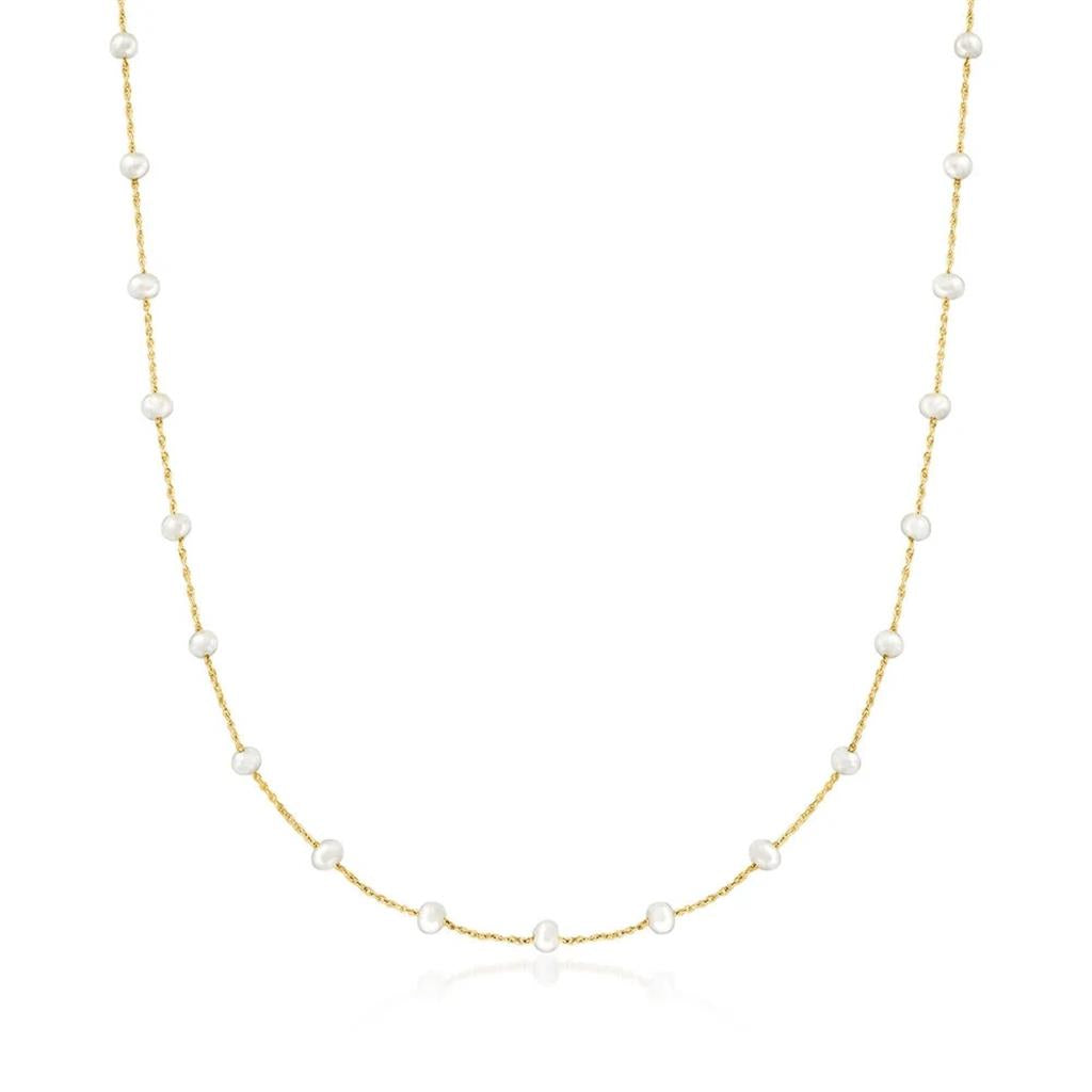 This elegant 19-inch necklace features 37 drilled Japanese Akoya white cultured pearls, each measuring 3–3.5 mm, delicately spaced along a polished 14k yellow gold chain. The luminous pearls create a soft, refined shimmer, perfectly complemented by the warm glow of gold. Finished with a secure lobster clasp, this station-style design offers timeless versatility—beautiful on its own or layered with other necklaces for a personalized look.