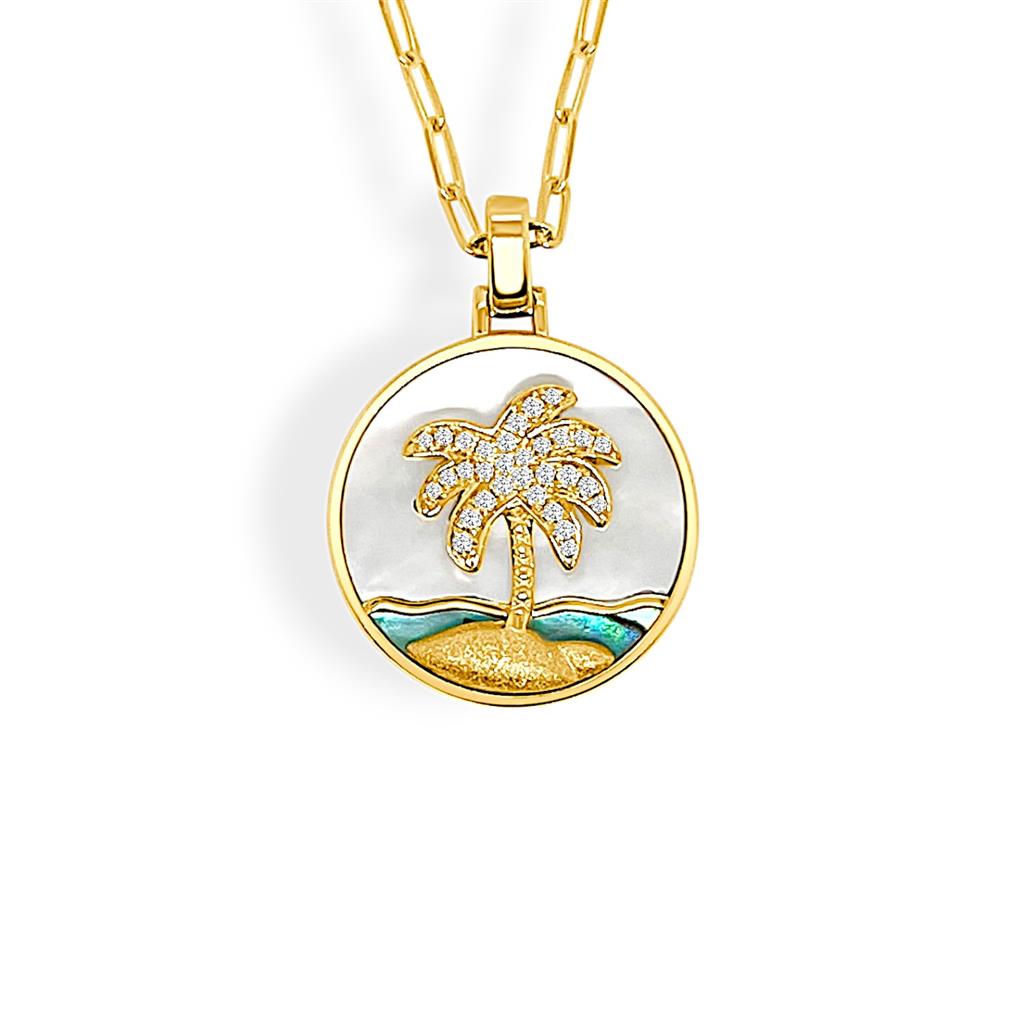 Davis Luxe 14k Yellow Gold Happy Collection Abalone and Mother of Pearl Palm Tree Pendant Necklace