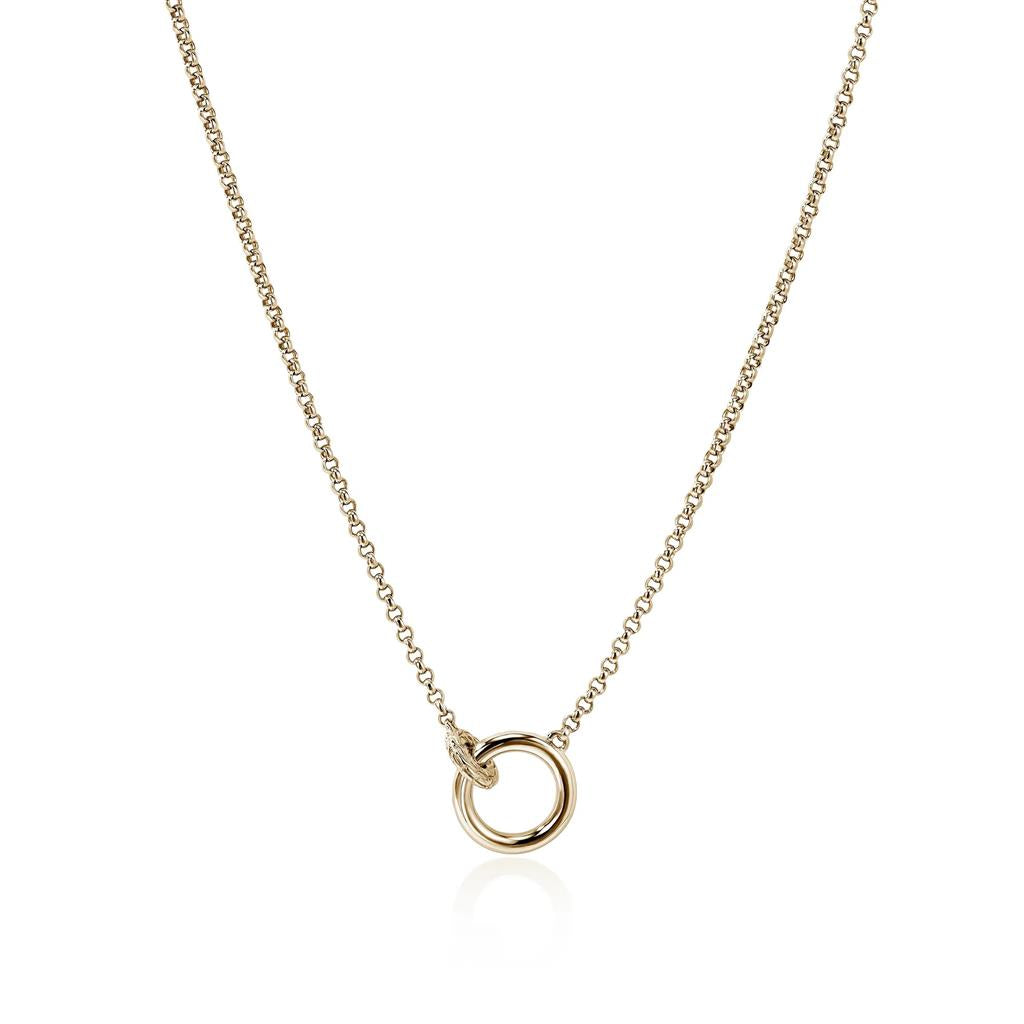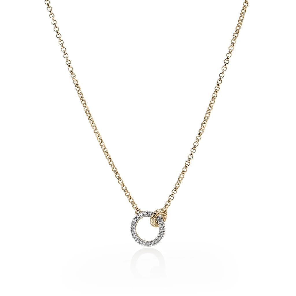 This essential interlinking circle necklace features John Hardy's signature mini Rolo chain. Artisan handcrafted in reclaimed gold and ethically sourced white diamonds. 16-18in length. Style no. NGGX987802DI