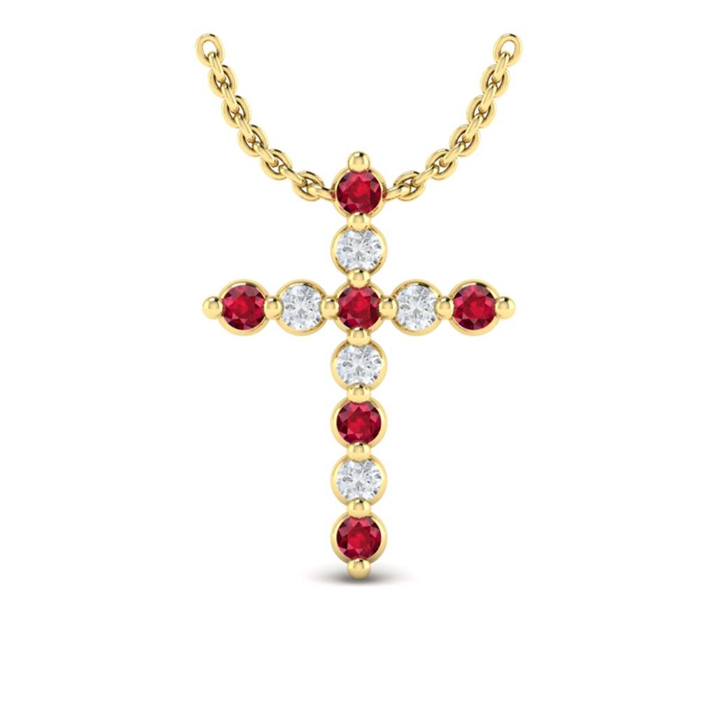 Elevate your elegance with the Vlora 14k Yellow Gold Adella Color Collection. This gemstone cross pendant features 6 shared single prong set round genuine rubies totaling 0.31 carats, alternating with 5 shared single prong set round brilliant cut diamonds totaling 0.22 carats, with G color and VS2-SI1 clarity. Suspended on an adjustable 16-18" cable chain and secured with a lobster clasp, this necklace combines the captivating beauty of rubies with the brilliance of diamonds, making it a stunning addition to any jewelry collection.