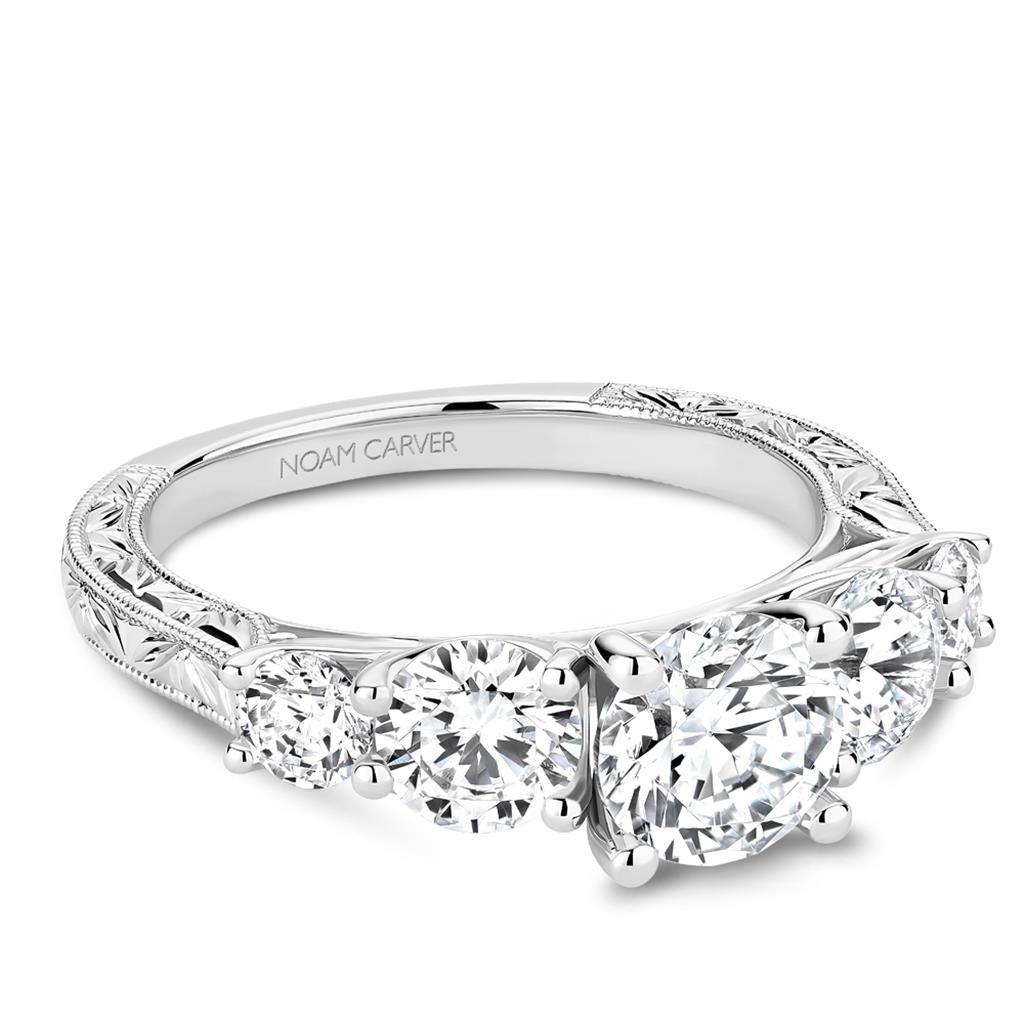 This exquisite Noam Carver 14k white gold engagement ring setting captures the essence of vintage elegance. Four shared prong-set round brilliant cut diamonds, totaling 1.34ctw of G/H color and SI1 clarity, grace the milgrain-trimmed hand-engraved shank, creating a captivating blend of artistry and brilliance. The cathedral design beautifully elevates the setting, crafted to hold a 1.5-carat round brilliant center stone, making it a timeless symbol of love and sophistication. Available in a finger size 6.5, with other sizes available upon request.