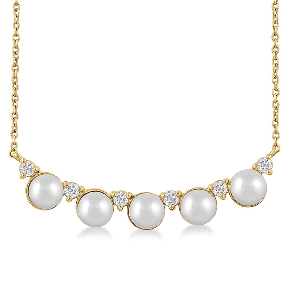 The Davis Classics 10k Yellow Gold Contour Pearl Bar Pendant Necklace is a graceful blend of elegance and modern design. This adjustable 16-18" necklace features a delicate bar pendant adorned with five white freshwater cultured pearls, each measuring 4.5mm. The pearls are beautifully complemented by six prong-set round brilliant cut diamonds, totaling 0.16 carats, with I/J color and SI2-I1 clarity, adding a touch of sparkle to the sophisticated design. The necklace is secured with a spring ring clasp, ensuring both style and ease of wear. Perfect for adding a refined touch to any outfit, this pearl and diamond necklace is an exquisite choice for those who appreciate both the timeless beauty of pearls and the brilliance of diamonds.