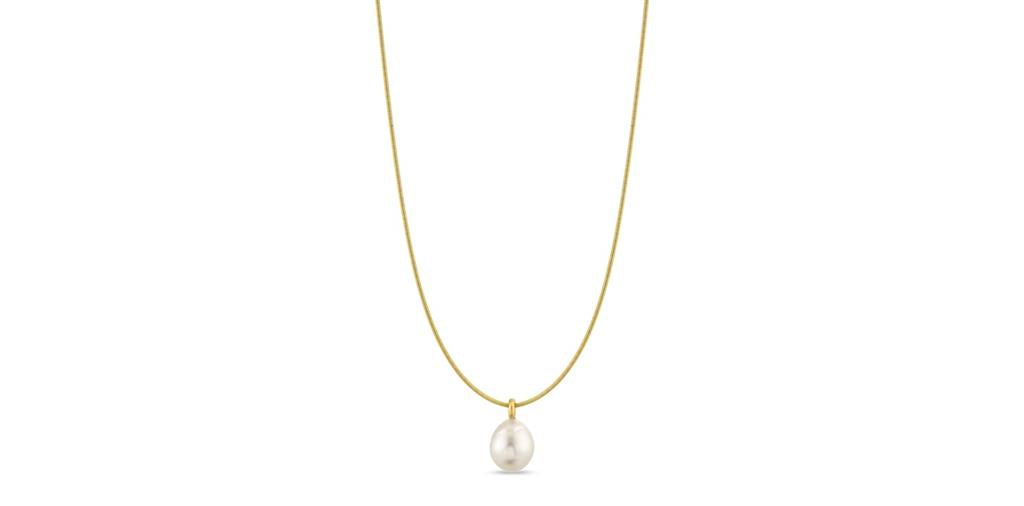 This sophisticated 16-inch flexible collar-style wire necklace is crafted in radiant 18k yellow gold and features a single South Sea white pearl measuring 9–11 mm. The pearl’s exceptional luster and elegant presence create a striking focal point that appears to float along the sleek wire design. Finished with a secure threaded clasp for seamless wear, this necklace blends modern minimalism with timeless luxury, making it an exquisite statement piece for any fine jewelry collection.