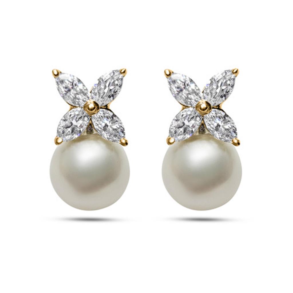 These exquisite 14k yellow gold stud earrings feature two luminous Japanese Akoya white cultured pearls measuring 7.5–8 mm, each gracefully suspended beneath a floral-inspired diamond design. The flowers are adorned with eight shared prong-set marquise-cut diamonds totaling 0.58 carats, sparkling with G/H color and VS2–SI1 clarity for a radiant, sophisticated finish. Secured with friction posts and backs, these earrings blend timeless elegance with delicate artistry, making them a refined addition to any fine jewelry collection.