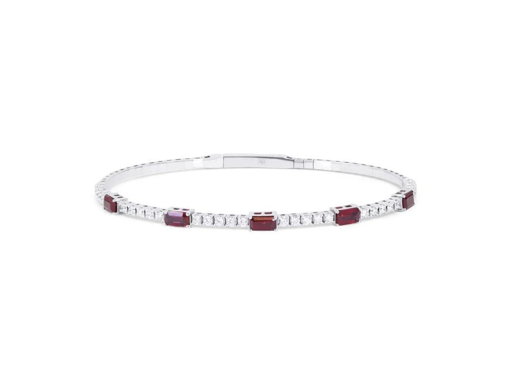 This exquisite Davis Luxe14k white gold Flexie bracelet features a captivating alternating design of emerald-cut natural rubies and round brilliant-cut diamonds. Five prong-set rubies totaling 0.77 carats bring a rich, vibrant red hue to the piece, while 30 prong-set round brilliant-cut diamonds totaling 0.77 carats add radiant sparkle with G/H color and SI1 clarity. Crafted in the flexible Flexie style for exceptional comfort and finished with a secure locking push clasp, this medium-size bracelet blends luxurious color with refined brilliance for an elegant, wearable statement.