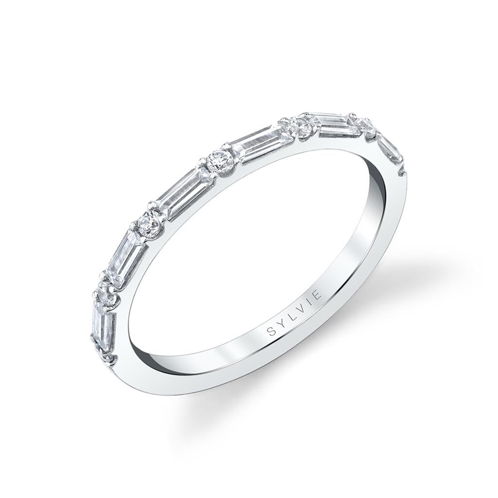 This timeless Sylvie 14K white gold stackable diamond band features an alternating pattern of shared prong-set round brilliant cut and baguette cut diamonds, creating a refined balance of shape and texture. The design includes seven round brilliant cut diamonds of H/I color and SI2 clarity, alternating with six baguette cut diamonds of G/H color and SI1 clarity, with a total combined weight of 0.52 carats. The mix of classic rounds and sleek baguettes offers subtle contrast and modern elegance, making this band ideal for stacking or wearing alone. This ring is currently available in size 6.5, with other sizes available upon request. Please note that the price is subject to change based on finger size and metal preference.