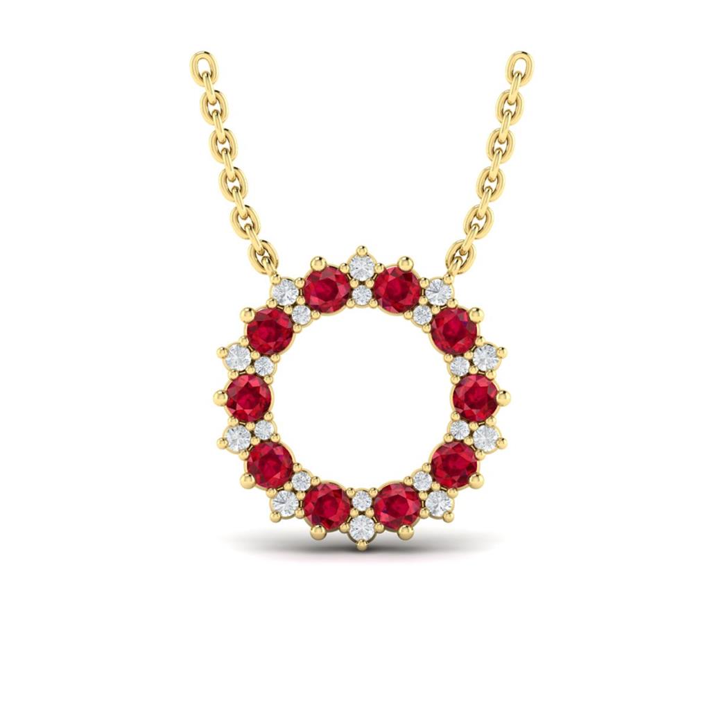 Brighten your style with the Vlora 14k Yellow Gold Marisol Collection. This 3/4" open circle design gemstone pendant features 10 shared prong set round genuine rubies totaling 0.98 carats, alternating with 20 shared prong set round brilliant cut diamonds totaling 0.26 carats, with G color and VS2-SI1 clarity. Affixed on an adjustable 16-18" cable chain and secured with a lobster clasp, this necklace combines the vibrant beauty of rubies with the brilliance of diamonds, making it a stunning addition to all jewelry collections.